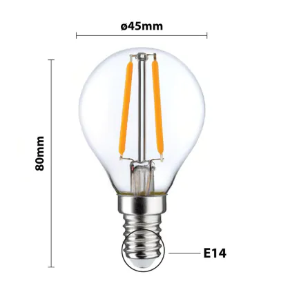 | Herstellername | Budgetlight Lucent Filament LED Lustre P45 E14 220-240V 2.5W 250LM CRI80 2700K NON-DIM (25W eqv.) | |