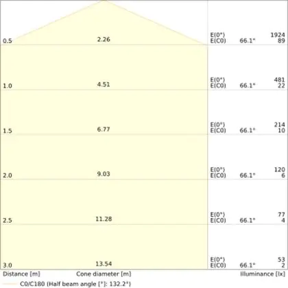Der Abstrahlwinkel bezeichnet den Winkel, in dem das Licht aus der Lichtquelle ausgestrahlt wird. Er wird in Grad (D) angegeben. Je geringer die Gradzahl des Abstrahlwinkels ist, desto kleiner ist auch der Durchmesser des Lichtkegels, den die Lichtquelle produziert. Beispiel: Wird eine Lampe mit einem Abstrahlwinkel von 60 Grad an der Decke (2,5 m Höhe) angebracht, erzeugt sie einen Lichtkegel von 2,9 Metern Durchmesser. Hat die Lampe hingegen einen Abstrahlwinkel von 120 Grad, beträgt der Lichtkegel 8,7 Meter im Durchmesser. |