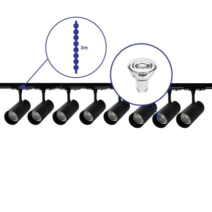 Description Bright Choice Ensemble complet Rail Monophasé Rail 3 Mètre Noir | incl. 8x Spot + GU10 2700K 3W Dimmable + Embout, Connecteur d’Alimentation et I-Connecteur