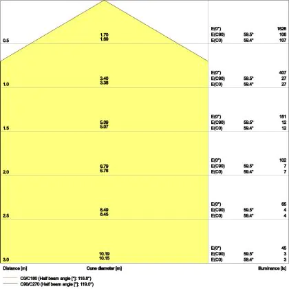 ![]() Le code couleur se compose de l'indice de rendu des couleurs (IRC) et de la température de couleur (Kelvin). Le premier chiffre indique le rendu des couleurs (1 = très mauvais rendu des couleurs, 9 = meilleure authenticité des couleurs). Le deuxième et troisième chiffre indiquent la température de la couleur. Exemple : Le code couleur "830" indique que la lampe a un bon rendu des couleurs (8) et une couleur de lumière blanche chaude (30 = 3000K). |