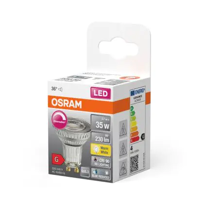 Description Osram LED Superstar Réflecteur Spot GU10 PAR16 3.7W 230lm 36D - 927 | Meilleur Rendu De Couleur - Dimmable - Remplacement 35W